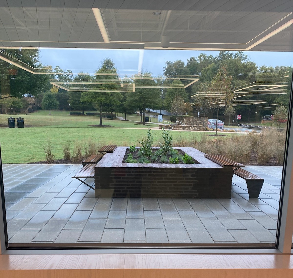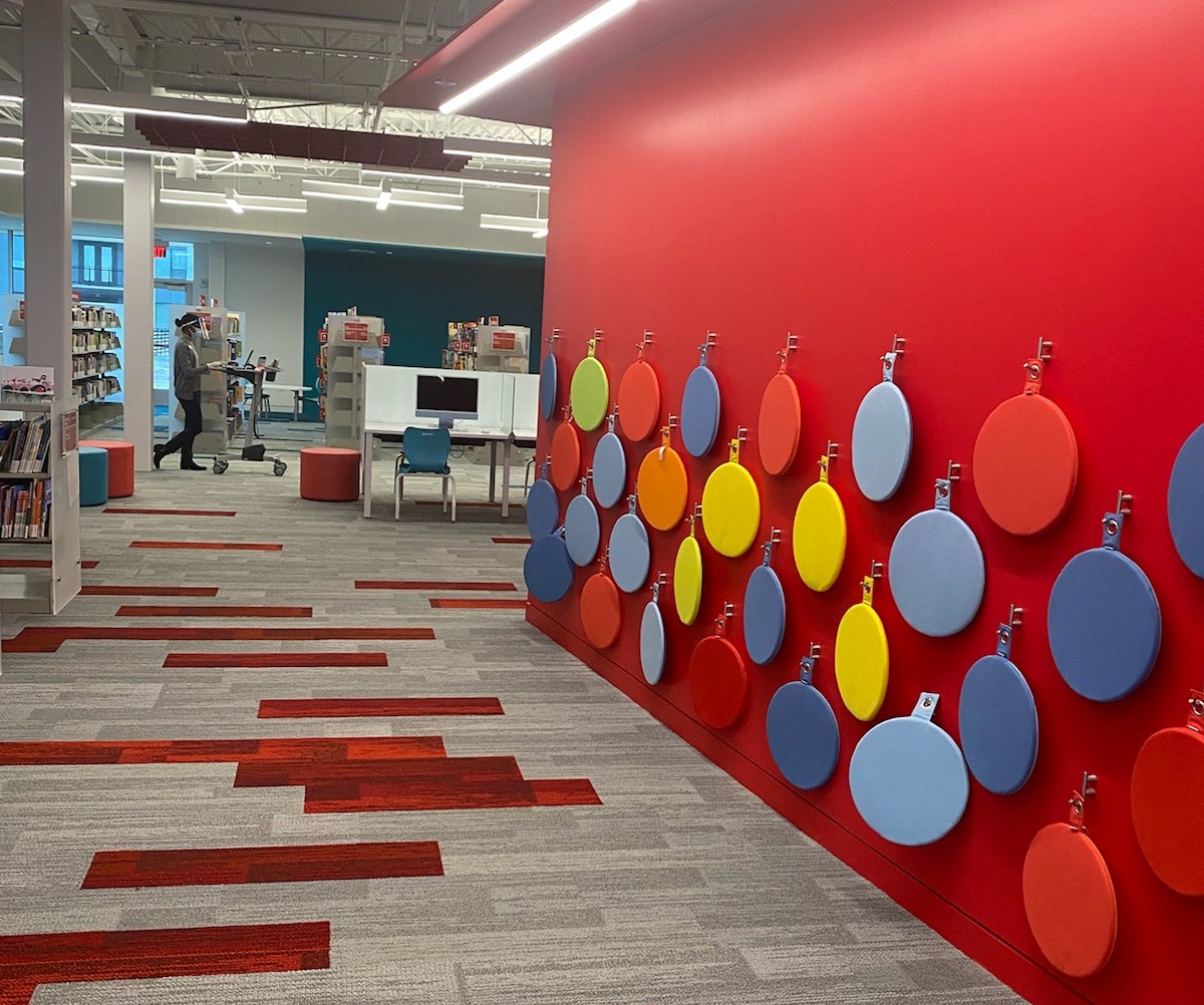 LARGE GLASS PANELS at the new Norcross Library allow visitors a sweeping view of Lillian Webb Park, in this photograph from Roving Photographer Frank Sharp when visiting the library for the first time. Planters have benches and tables for outdoor sitting, and there are more of these benches along the north side of the library. Sharp also took another photo of colorful sitting pads in the kid’s section of the library. The new library’s address is 5735 Buford Highway in Norcross.