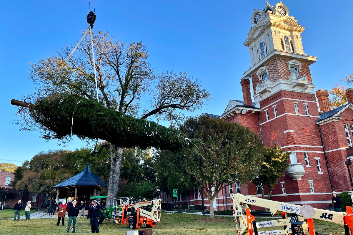 GWINNETT’S 2021 CHRISTMAS TREE is lifted by Maxim Crane of Mableton to its position at the Gwinnett Historic Courthouse in Lawrenceville. Crews transported the 38-foot Norway Spruce tree from the North Carolina mountains Monday and installed it on Tuesday. Parks and Recreation Manager Tina Pangle says that the county staff will decorate the tree for the lighting tradition that takes place on Thanksgiving Day. The tree will remain on display throughout the holiday season. (Photo by Bruce Johnson.)