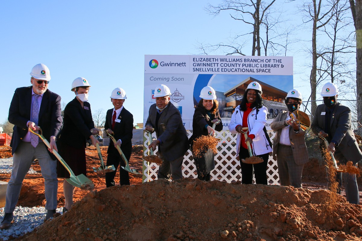 SHOVELING AWAY at the groundbreaking of the Elizabeth Williams Library in Snellville are, from left, Charles Pace, director of the Gwinnett County Public Library; State Rep. Rebecca Mitchell; JT Wu, Library Foundation secretary; Sheriff Keybo Taylor; Snellville Mayor Barbara Bender; Commission Chairwoman Nicole Hendrickson; and Commissioners Marlene Fosque and Jasper Watkins. Gwinnett County and the city of Snellville are jointly funding the $10.2 million project using 2017 SPLOST program dollars. It is expected to be open in the fourth quarter of 2022. It is in downtown Snellville, and will replace the current library on Lenora Church Road.