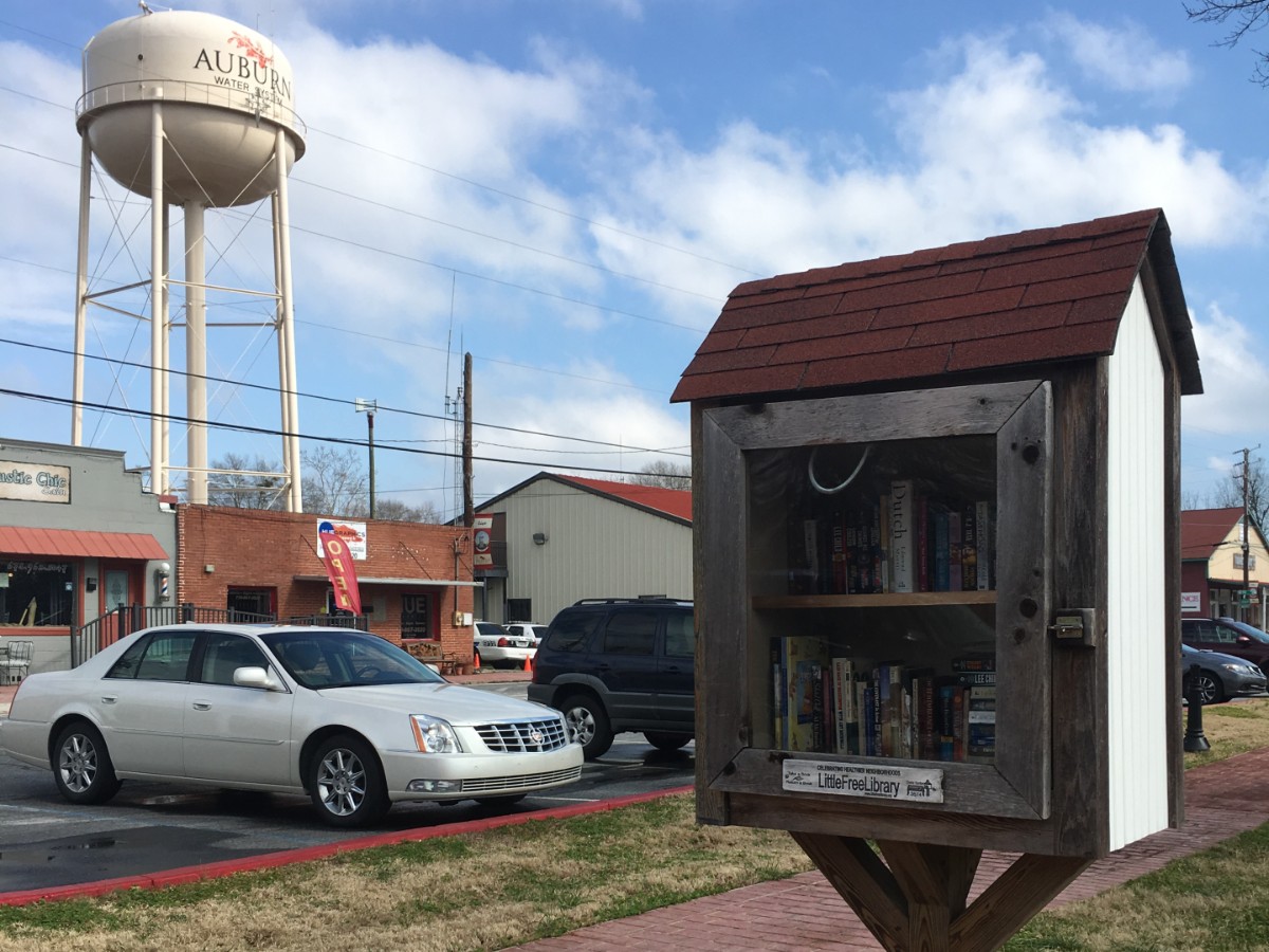 MANY GWINNETT COMMUNITIES are sporting Little Free Libraries, where you can pick out a book to read (and keep) if you like. Here’s the Little Free Library in Auburn, right in the middle of town. You’re doing your neighborhood service when you contribute books to these libraries for your neighbors to enjoy.