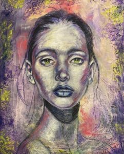 “Faintly Remembered” by Micah Goguen Micah Goguen who has taught classes in the gallery and teaches workshops throughout the Southeast. His mesmerizing multi-media painting in this exhibit is “Faintly Remembered.”