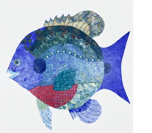 - Gail Lenahan excels in fabric collage with added elements such as twine or beads to create her fantasy, fun paintings of fish and animals. A very appealing one in this show is a bright, cheerful blue fish titled “Fantasy Bluegill #2” that may swim into your heart.
