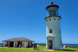 Peel writes: “The tower is relatively short at only 52-feet. When originally built, the lighthouse had the largest hand-blown clamshell lens in the world. The revolving lens, which was first illuminated on May 1, 1913, produced a double flash every ten seconds that was visible up to a distance of 21 nautical miles. The lens is one of only seven of its type in its original position. It originally cost $12,000 and is now worth $1 million. Its beacon is famous for having alerted the pilots of the U.S. Army and Navy’s first attempt at flying from the mainland to Hawaii in 1927. When the exhausted pilots saw the flashing beacon of the Kīlauea Lighthouse, they realized then that they had overshot the island of Oahu, notifying them of the need to turn back so they could land safely at Wheeler Field.”