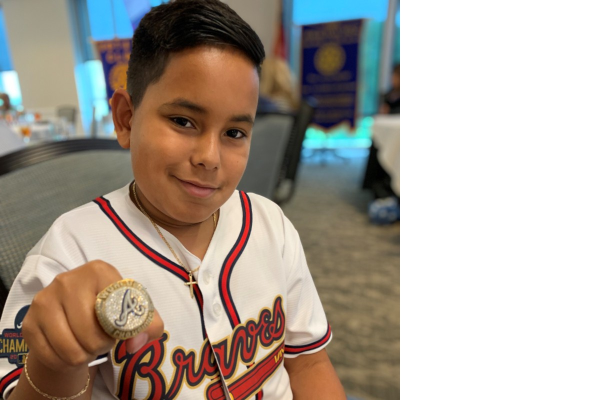 RING GIVEAWAY: The Atlanta Braves world champion ring caught the fancy of Giovani Laguer, son of Suleima Salgado, as this ring replica was passed around when Giovani attended a recent meeting of the Gwinnett Rotary Club. The Gwinnett Stripers on July 30 and 31 will have a World Champions Braves Replica Ring Giveaway thanks to Coolray Heating and Cooling. The first 2,500 ticketed fans through the gates at Coolray Field on these two dates will receive a 2021 Braves replica championship ring.