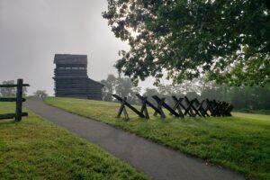 “The observation tower was made of wooden logs and originally erected by the Virginia State Forest Service in 1942. It was used to view mountain ranges and look for hazards or fires. The tower is accessible for visitors willing to climb its steps for a spectacular view of Buffalo Mountain, Rich Hill, and the plateau of gentle hills that make up the Carolina Piedmont in North Carolina. As can be seen in the mystery photo, the site includes an exhibit of the various types of wooden fences used by the early settlers of the region.These fence displays were first constructed in 1939, by the Civilian Public Service Enrollees and have been maintained ever since.”