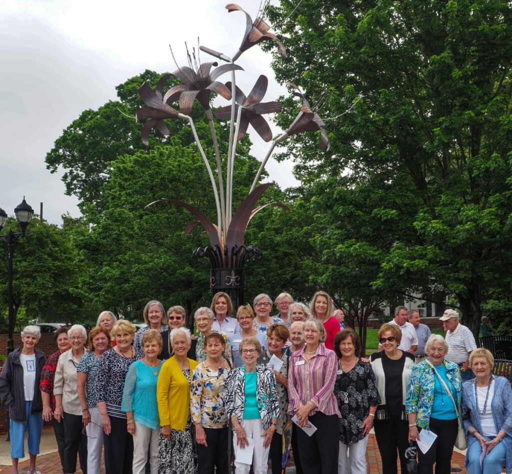 DEDICATION DAY: Members of the Stonehedge Garden Club of Buford gathered for the dedication of a gigantic sculpture of a daylily at the Buford Main Street Park and Amphitheater on May 4, 2021. The sculpture was the Mystery Photo of last week and is the work of Jim Bradford of Buford. For more details on this sculpture, go to the Mystery Photo below. (Photo by Stewart Woodard.)