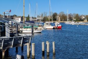 “Chicago native, Frances Crane Lillie, gifted the tower and the adjacent flower garden to Saint Joseph’s to remind the scientists who study at the Marine Biological Laboratory across the pond that there is another and valid aspect of life. Boston architect Charles Coolidge designed the tower and it was built in 1929 on land given to Saint Joseph’s. A granite block sea wall had to be built to support it and make the lot level with the road because, at the time, the land sloped down to the water. The bells first rang from the tower at 5:45 a.m. Christmas morning of 1929.”