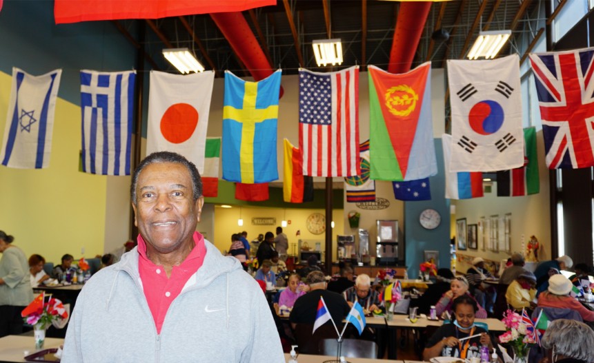 FESTIVE SETTING: John Buckner was among those attending the annual international meeting at the Lawrenceville Senior Center at Rhodes Jordan Park on Monday Angel Finwick, program manager, led the group in a trivia quiz about the many countries, which proved both informative and educational. (Photo by Roving Photographer Frank Sharp.)