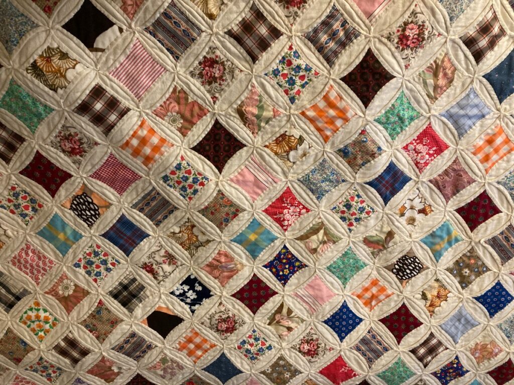 Often housewives would be quilting after the evening meal, coming off working hard during the day with the washing and ironing, preparing meals, or even toiling in the fields. Sitting down amidst the awkward quilting frame was also restful, compared to a housewife’s other chores. Often family members or neighbors gathered in community “Quilting circles.” It was enjoyable, besides being most utilitarian for the coming cold weather. And quilting is a quiet job, allowing the quilters to talk among themselves, sometimes even swapping gossip!