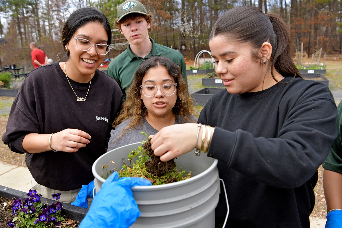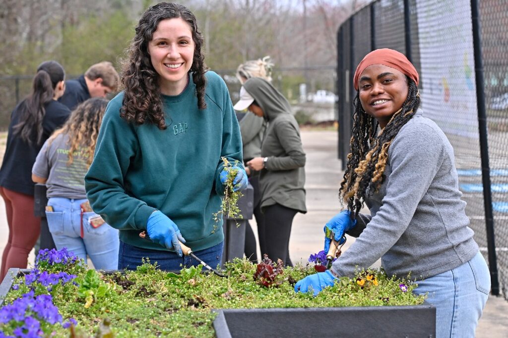 DIFFERENT SPRING BREAK: For some college students, spring break means relaxation, travel and respite from the classroom. But for some Georgia Gwinnett College (GGC) students, spring break brought an opportunity to serve, learn and engage with communities locally and regionally through the college’s alternative spring break program. Spearheaded by GGC’s Student Affairs division, the initiative provides students opportunities to collaborate with nonprofits and community organizers through service projects and cultural experiences. Jenna Scott and Exceersia Marfo (above) were working in the horticulture area. In the photo below, Achint Tuteja, Jacob Corn, Gaby Sifuentes, Maria Diaz-Oimentel were sorting pansies. This year, GGC’s Alternative Spring Break included opportunities for students to serve locally at eight different sites in Gwinnett County. In addition, a trip to Selma, Ala., focused on civic and voter engagement, and another to Walland, Tenn., focused on environmental sustainability.
