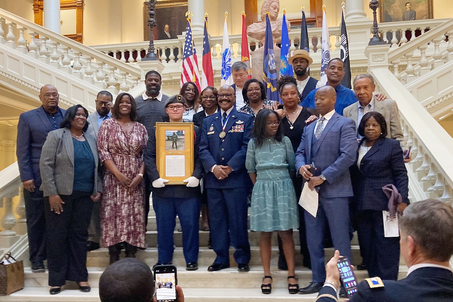 HONORED AT THE CAPITOL: The extended family of Lt. Col. James W. Williams of Norcross gathered at the Georgia Capitol for the hanging of plaques recognizing members of the Georgia Military Veterans Hall of Fame last week. Colonel Williams, a jet pilot, was shot down over North Vietnam and survived as a prisoner of war for nearly a year at the Hanoi Hilton. For a look at how the Veterans Hall of Fame began, see Today’s Focus below. (Click to enlarge.)