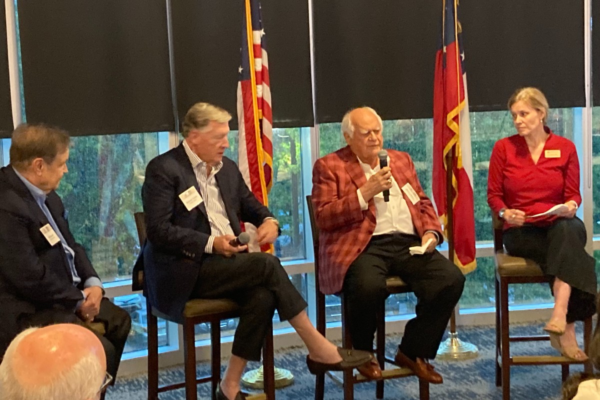 MASON TRIBUTE: Gwinnett’s legendary Wayne Mason was honored Wednesday night at the Gwinnett Chamber building on the publication of a book about him and his brother’s development and civic activities.  A panel discussion about Mason’s involvement with Gwinnett was led by Author Catherine Lewis (right) and included Bill Russell and Richard Tucker. The book is entitled Above and Beyond, the Mason Family, published by Mercer University Press, and sells for $27. Mason’s son, Keith, coordinated the tribute, but was not present, since being treated for a detached retina in Louisville, Ky.  A Zoom link allowed him to follow the tribute.