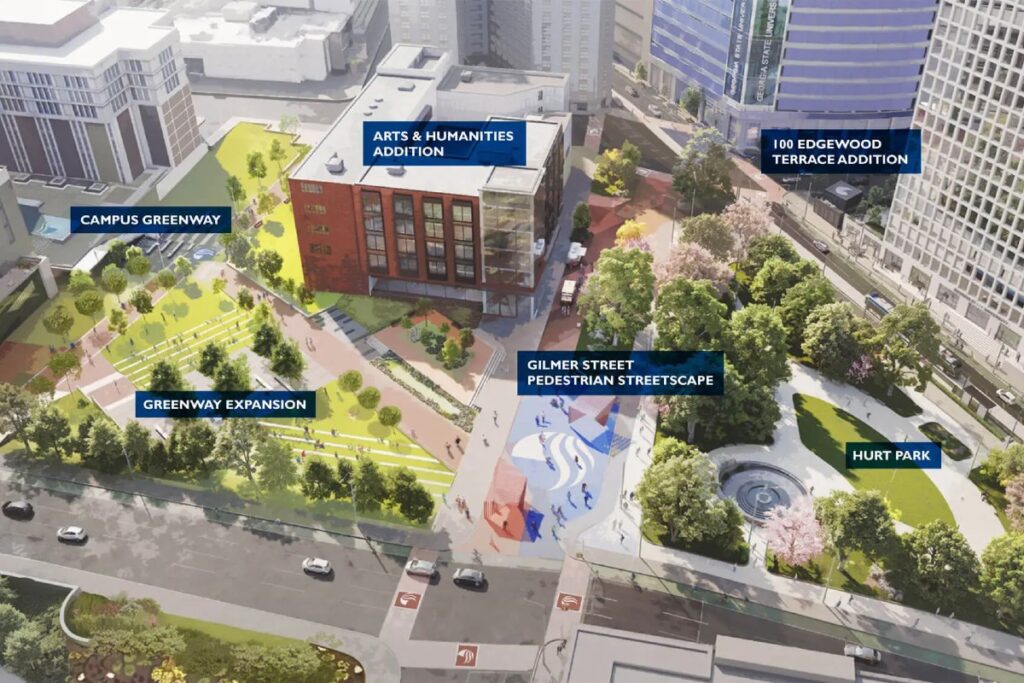 The imagined vision for the upgrades will connect two major parks on campus, Woodruff Park and Hurt Park, and add more greenspace to the urban campus. To do this, the longstanding Sparks Hall building will be demolished.