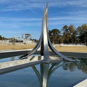 Also recognizing the photo were Mickey Merkel, Berkeley Lake; Bill McLees, Norcross; George Graf, Palmyra, Va.; Allan Peel of San Antonio, Tex.; and Jay Altman of Columbia, S.C., who added: “ The statue is named ‘Greater Good,’ and is located in Town Center on Main and DeLay Nature Park in Suwanee. Standing over 20 feet tall and with a diameter of 24 feet, it  is comprised of six forms emerging from the reflecting pool in the park. The forms gracefully slope together and support each other as they rise to cover a circular area with a curved seating bench, the walls of which sit level with the water of the pool. The seals of each of the six branches of our military are represented on the walls, corresponding to the six rising forms.”