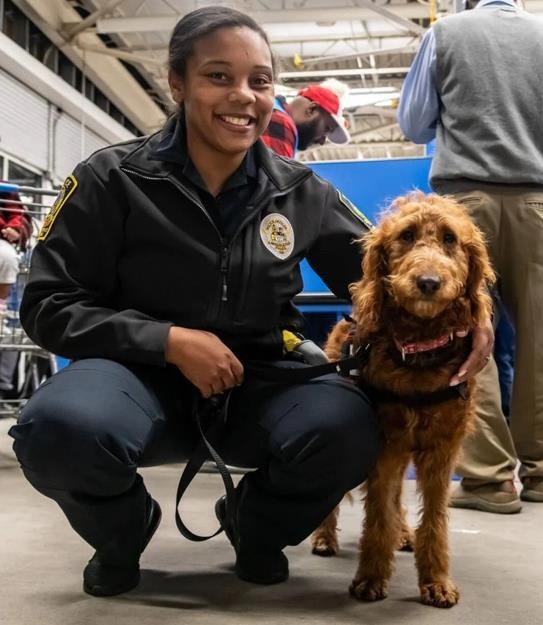 FIRST FOR THE COUNTY: The City of Lawrenceville has the first community wellness dog, “Ro,” shown with Officer Quolettea Cole.  The seven-month-old Goldendoodle is a highly trained therapy dog whose primary role is to provide comfort, support, and emotional relief in times of stress or trauma. For more details, see Notable below.