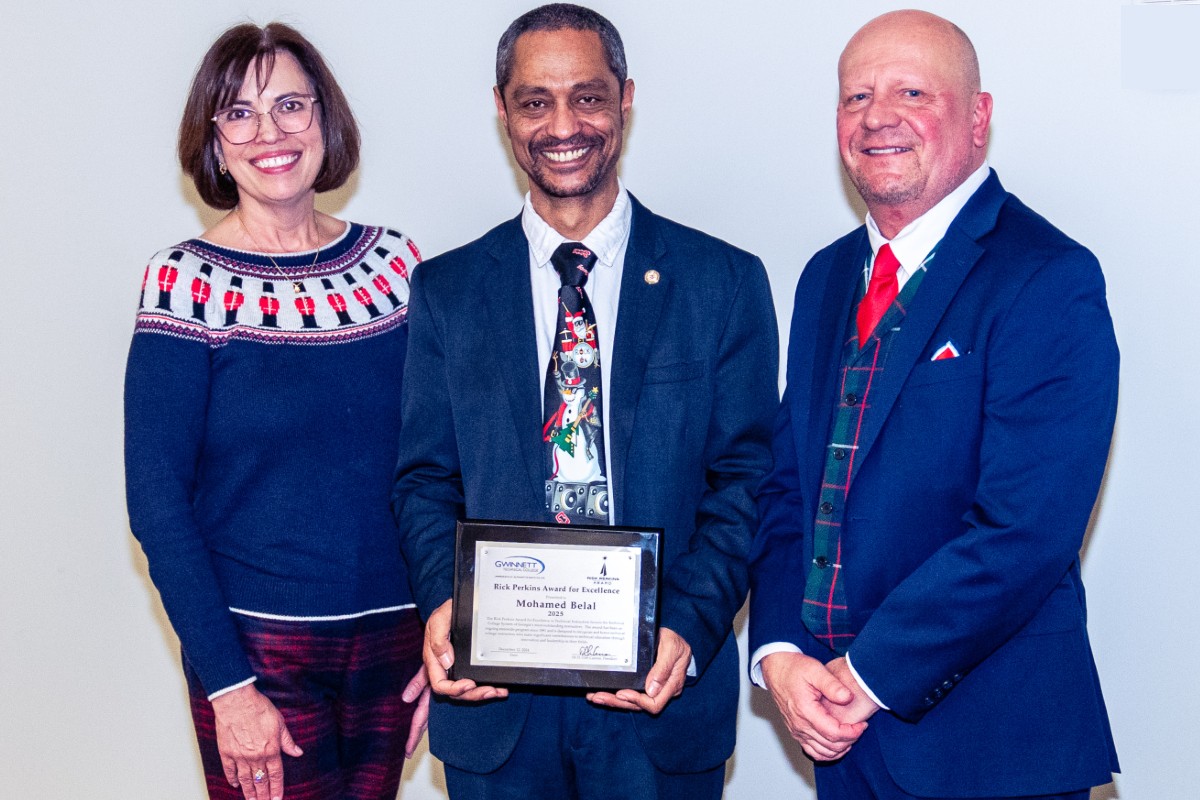 TOP INSTRUCTOR: Gwinnett Technical College recently named its top instructor, the Rick Perkins Instructor of the Year recipient for 2025. He is Mohamed Belal, center. Also shown are, on the left, Rebecca Alexander, vice president of academic affairs; Belal,; and on the right, Dr. Glen Cannon, president of Gwinnett Technical College. For more details, see Notable below. (Photo Credit: Jeremy Statum.)