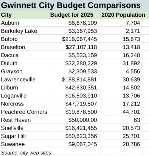 Other large budgets for cities are in Sugar Hill with a budget of $50 million (which operates its own golf course as an enterprise fund); Norcross, at $47.7 million; and Duluth, with a budget for 2025 at $32.3 million.
