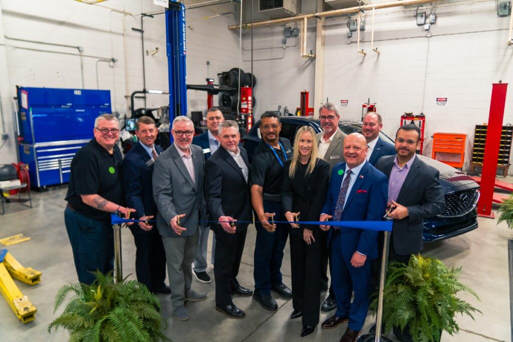 NEW PARTNERSHIP: Gwinnett Technical College has a new partnership with Mazda North American Operations to launch the Mazda Automotive Student Training program. This innovative program educates students, provides career training, and prepares graduates with the skills necessary to excel as technicians at Mazda dealerships. From left on the front row are Bob Bauman, Automotive Program Director; Greg Dozier, Commissioner of Technical College System of Georgia; Tim Haggerty, and Ryan McCormick of Mazda; Patrick Mahaffey, Dean of Engineering; Mickelle Kahila, Mazda; Dr. Glen Cannon, president of Gwinnett Technical College; and Albert Sorto, Rudhil Companies and Gwinnett Tech board of directors. On the back row are Mark Peavy, Technical College System of Georgia; Jon Davisson, Mazda; and John Thomas, Technical College of Georgia. (Photo by Jeremy Statum.)