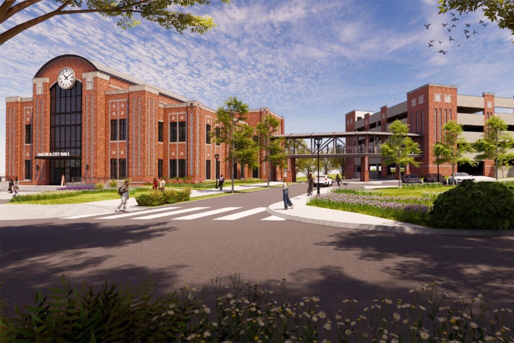 NEW CITY HALL IN PLANS: The city of Dacula is planning a new $40.3 million city hall and parking garage and amphitheatre. It will be built across Harbins Road from the current city hall. The new city hall will have 42,732 square feet of space, and the parking garage will have 298 spaces, including charging station for electrical vehicles. The amphitheater and restroom consists of 6,475 square feet. Bowen and Watson construction firm of Toccoa has been hired to erect the structures. It is anticipated that construction will take 30 months, with the opening planned toward the end of 2027. An amenity of the City Hall will be a roof top event space, including indoor space plus two patios. GwinnettForum has learned that the new city hall property is on land that was once the Ashworth (Jerry and Charles) homestead. For a site plan and another conceptual photo, see Lagniappe below.
