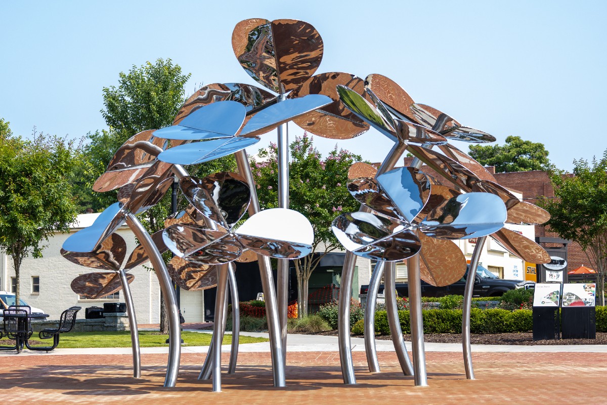 NEW SCULPTURES: Gwinnett County officials on Monday celebrated the installation of two new sculptures, “Make A Wish” and “Vibrantly Connected,” at the Bicentennial Plaza and Trailhead in downtown Lawrenceville. Designed by Georgia artist David Landis, the 11,000-pound “Make a Wish” sculpture draws residents, families and visitors through a stainless-steel clover forest. The sculpture captures the magic of discovery, creating an interactive, enchanting experience where visitors can find a four-leaf clover and make a wish. At the trailhead, “Vibrantly Connected” stands 12 feet tall and features three highly polished stainless-steel ginkgo leaves that intersect to create negative space that reflects the Gwinnett logo. The sculpture symbolizes resilience, unity and the county’s deep-rooted diversity. The ginkgo, one of the world’s oldest tree species, was chosen for its strength, history.