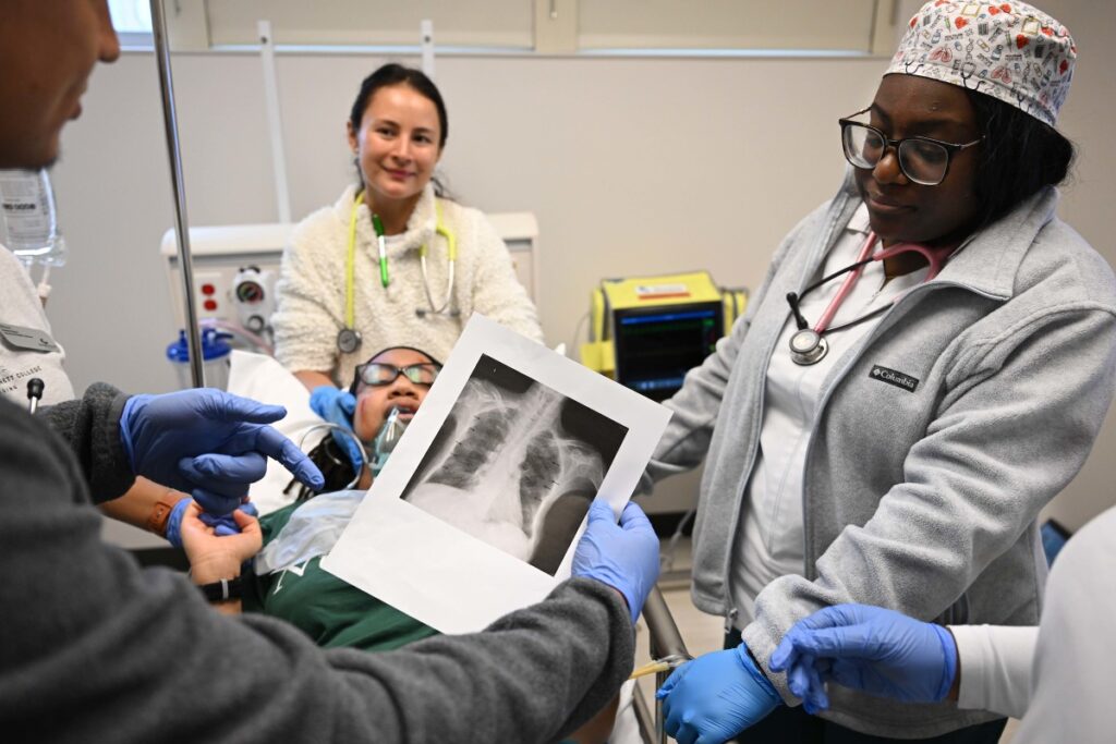 Hugo Torres, Chelsi Bolanos, and Trinity Strickland read Raina Emerson’s x-rays while participating in Emergency Day on Friday, April 25, 2025 at the Allied Health and Science Building, gaining hands-on experience in simulated crisis response scenarios. Photo by Daniel Melograna/Georgia Gwinnett College.