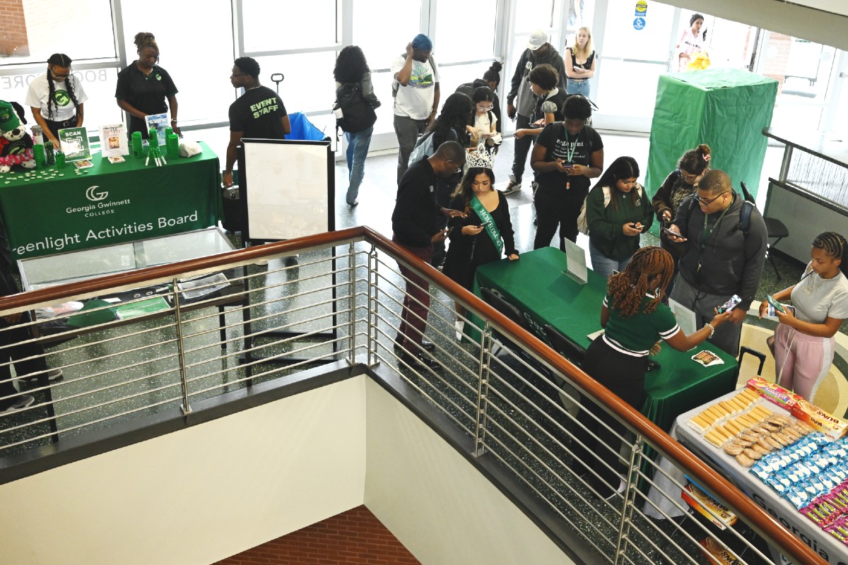 FALL ACTIVITIES UNDERWAY AT GGC: Georgia Gwinnett College (GGC) is brimming with activity as students descend onto campus to start their fall classes. GGC Student Life handed out snacks and giveaways to students in the Student Center during the first day of class on August 11. Among the students shown is Gaby Sifuentes of Buford, the homecoming queen in her tiara. Nearly 1,000 students unpacked their bags and moved into the residence halls on campus. (Photo by Daniel Melograna/GGC.)