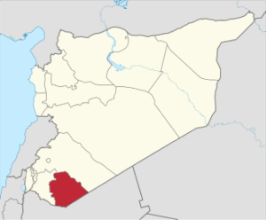 Map of the province that includes Sweida in southern Syria with Israel to the west and Jordan to the south. Via Wikipedia.