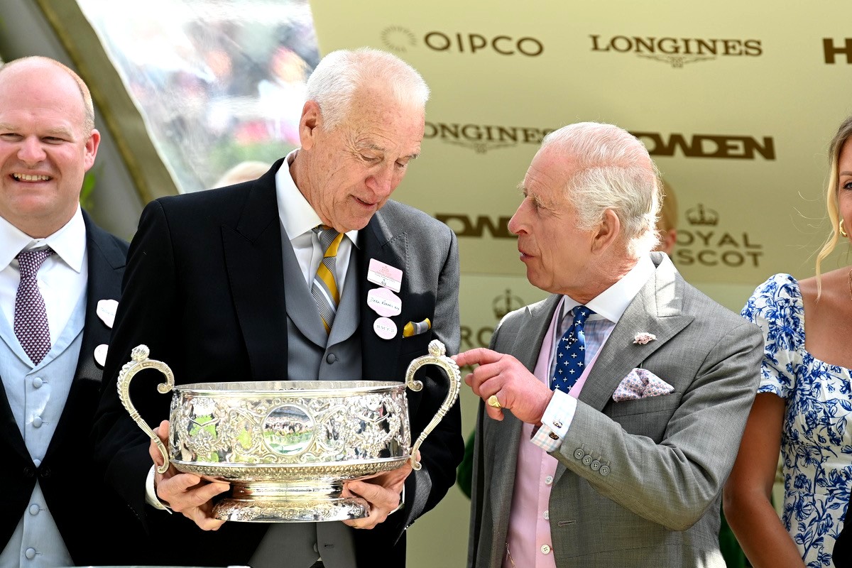 ROYAL PRESENTATION: Suwanee resident Dean Reeves holds the Coronation Cup and speaks with King Charles of England on June 21, 2024. Reeves and his partner’s horse, the filly Porta Fortuna, had just won the Coronation Stakes at the Royal Ascot race track near London. For more on how Reeves got into horse racing, see Elliott Brack’s Perspective below. (Photo by Healy Racing Photography.)
