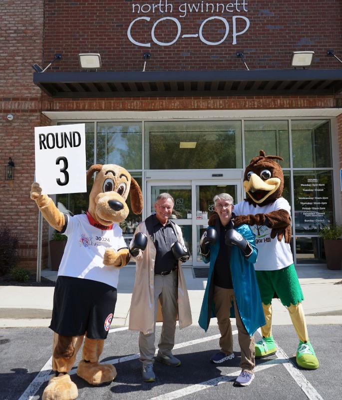 IT’S TIME FOR THE TIEBREAKER. The gloves are back on as the City of Suwanee and City of Sugar Hill gear up for Round 3 of the Food Fight, a friendly but fierce competition to support the North Gwinnett Co-Op. This year’s bout runs from September 20 (Suwanee Fest) through October 19 (Sugar Rush). Round 1 went to Sugar Hill. In round 2, Suwanee came back swinging! Now it’s time for the third match and both cities are in it to win it. From left are Parker (Suwanee’s mascot); Suwanee Mayor Jimmy Burnette; Sugar Hill Mayor Brandon Hembre; and  Eddy (Sugar Hill’s mascot).
