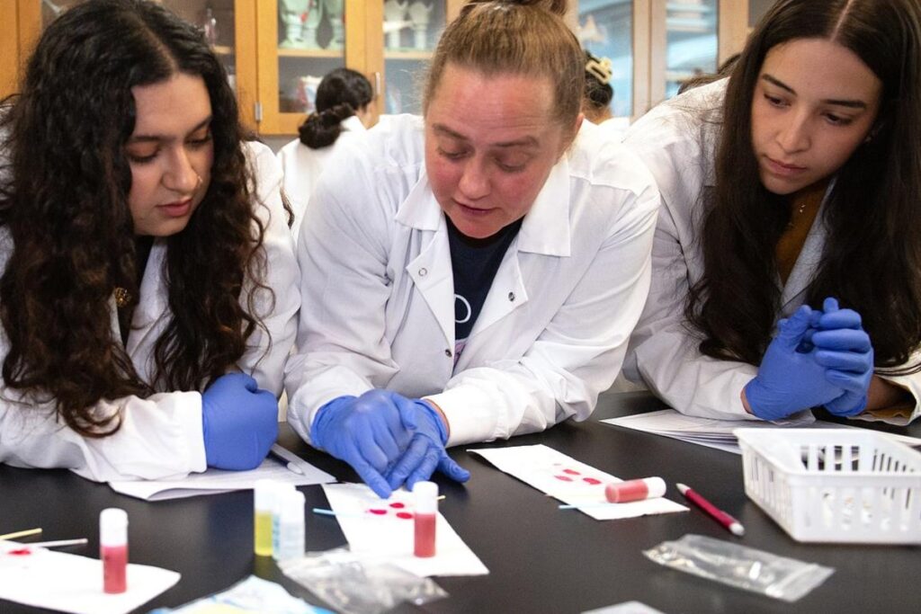 Dr. Victoria Bali, assistant professor of biology, recently taught her students how to type blood, a follow-up on learning about the immune system. Her students were tasked with determining the blood type of four patients. To do this, the students worked with samples of synthetic blood.