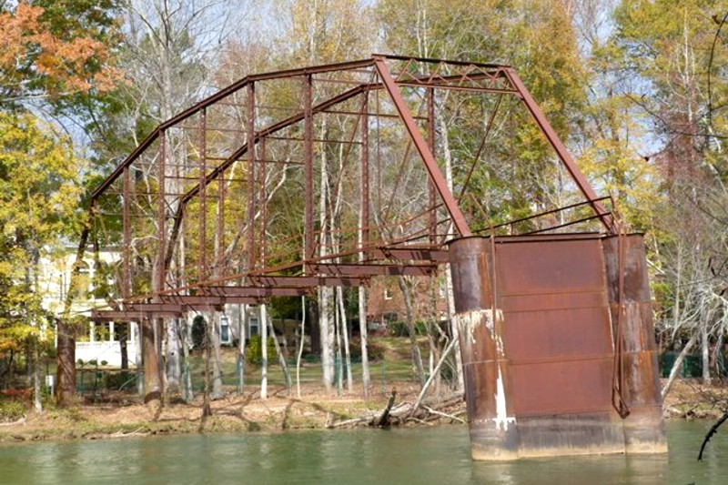UNVEILING SOON: A new historical marker honoring the legacy of the original Jones Bridge, will be unveiled on Friday, Nov. 7 at 11 a.m. at the pedestrian bridge located in Peachtree Corners at the Town Center entrance. For more on the marker, see Upcoming below. Here is the way half of Jones Bridge looked like until recently, when this portion of the bridge collapsed into the Chattahoochee River from the force of the current. The other half of the bridge was stolen by yeggs and sold for scrap in the latter days of World War II. (Photo copyright by Nathan Holth, Historic Bridges.org, used by permission.)