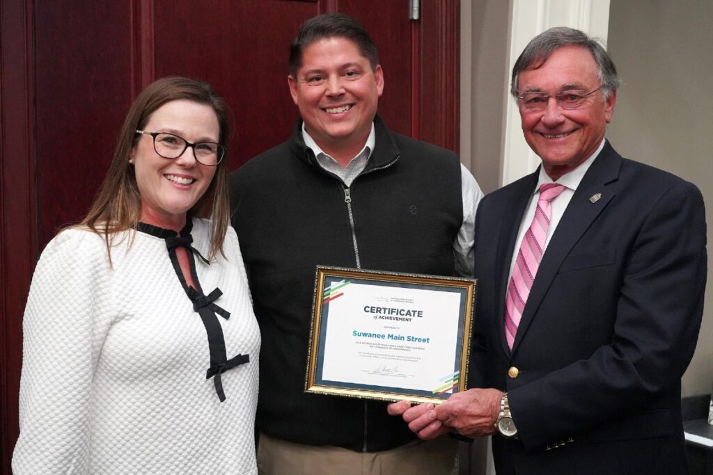 The City of Suwanee is honored to be named a Georgia Exceptional Main Street (GEMS) community by the Georgia Department of Community Affairs. This designation recognizes Suwanee as one of the top Main Street programs in the state, celebrating the city’s commitment to downtown revitalization, economic development, and community innovation. At the October 26 City Council meeting, Cherie Bennett, left, director of the Office of Downtown Development at the Georgia Department of Community Affairs, formally presented the City of Suwanee with the Georgia Exceptional Main Street (GEMS) designation and award. In the center is Suwanee Economic Development Manager Chris Hardin, and at the right is Mayor Jimmy Burnette.