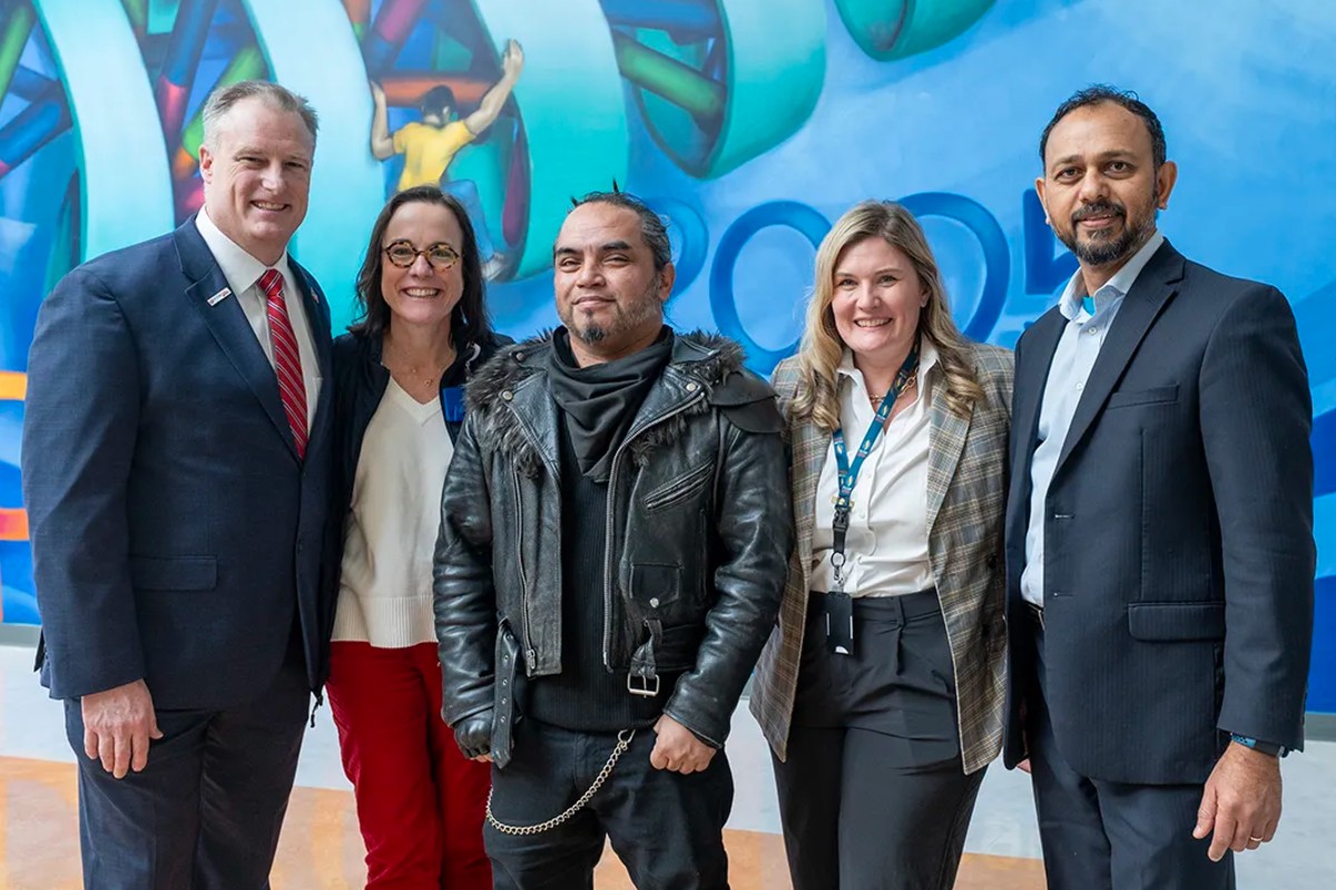 At the ceremony unveiling a new giant mural at PCOM, are from left, Dean Brian Mann, School of Health Professions and Sciences; Dean Sara (Mandy) Reece, school of Pharmacy; the artist, Mr. Totem;  Joy Williford, media relations; and John Khan, Chief of Campus Operations.