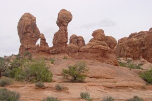 The Windows Section of the park was given National Monument Status by President Herbert Hoover on April 12, 1929, and the name “Garden of Eden” was assigned by Frank Beckwith (1875–1951), a local newspaper editor and amateur scientist, who was tasked by the government with mapping the monument and naming its features. In Beckwith’s vivid imagination, the three rock formations on the left of the mystery photo resembled a heavier-set male figure facing an hourglass-shaped female, standing on either side of a golf ball on a golf tee. In his twisted mind, he saw Adam, facing Eden, as they approached the Devil’s Golf Ball.”