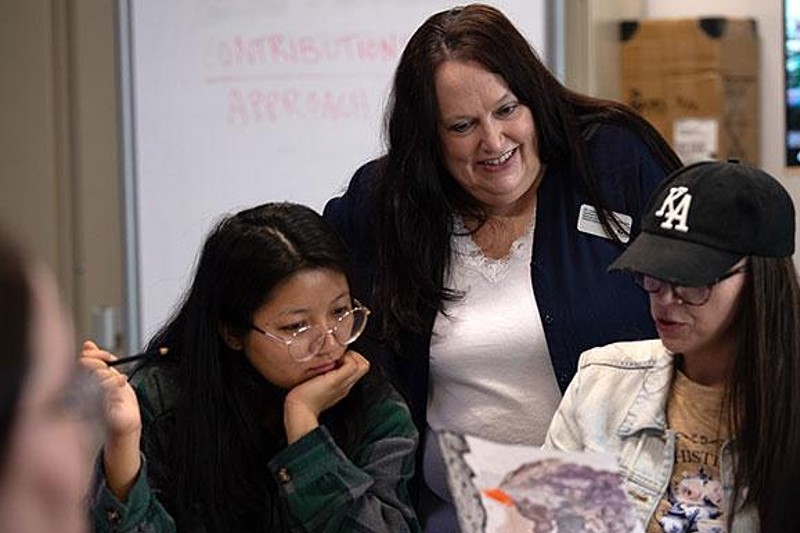 Kristina Jackson (right) discusses the artwork she created with Jen Twe (left) and Dr. Jamie Caudill (center) during the recent Concepts and Best Practices for Teaching Writing with Practicum class at Georgia Gwinnett College. (Photo Daniel Melograna/GGC.)